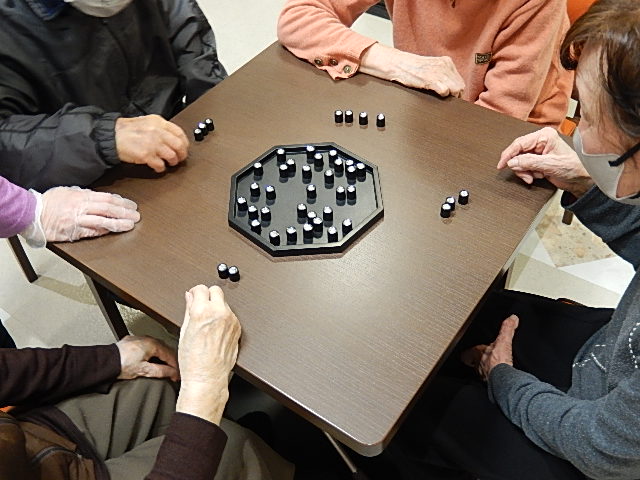 3月15日にボードゲームを入居者の皆さんに楽しんでいただきました。ボードゲームショップのファニーテーブル様にご協力いただき、たくさんのボードゲームに触れ合うことができました。数日前から展示をしボードゲームへの???を減らし、当日は入居者が抵抗なく楽しんでいただけるように工夫しました。最初にファニーテーブル様からのレクチャーを受け、まずは職員が楽しめるように準備しました。入居者3,4人と職員ひとりを1グループとして、5テーブル用意しました。「カラーボール」「シューティングゲーム(左写真)」「キチブーン(真ん中写真)」「本物ダイヤ(右写真)」「もんじろう」「パクモグ」「スティッキー」「テディメモリー」「ハリガリジュニア」などゲーム名を見ただけでも、ワクワク気分になってくるボードゲームを施設所有のものに加え、ファニーテーブル様がたくさん持ち込んでくださいました。入居者の好みで選んでいただき挑戦してみました。職員の予想を上回りどんなゲームも積極的に挑み、思いっきり楽しむことができました。同じ施設で過ごしていても、あまり関わりのない入居者は多くいらっしゃいますが、本日は一丸となってひとつのテーブルにつき和気あいあい、闘志満々で盛り上がっていました。「ゲーム力」のすごさにビックリしました。