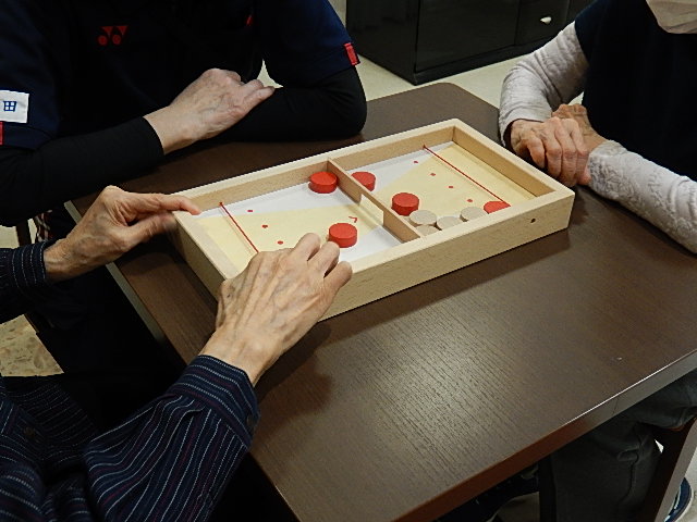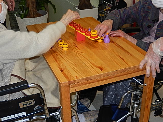 3月15日にボードゲームを入居者の皆さんに楽しんでいただきました。ボードゲームショップのファニーテーブル様にご協力いただき、たくさんのボードゲームに触れ合うことができました。数日前から展示をしボードゲームへの???を減らし、当日は入居者が抵抗なく楽しんでいただけるように工夫しました。最初にファニーテーブル様からのレクチャーを受け、まずは職員が楽しめるように準備しました。入居者3,4人と職員ひとりを1グループとして、5テーブル用意しました。「カラーボール」「シューティングゲーム(左写真)」「キチブーン(真ん中写真)」「本物ダイヤ(右写真)」「もんじろう」「パクモグ」「スティッキー」「テディメモリー」「ハリガリジュニア」などゲーム名を見ただけでも、ワクワク気分になってくるボードゲームを施設所有のものに加え、ファニーテーブル様がたくさん持ち込んでくださいました。入居者の好みで選んでいただき挑戦してみました。職員の予想を上回りどんなゲームも積極的に挑み、思いっきり楽しむことができました。同じ施設で過ごしていても、あまり関わりのない入居者は多くいらっしゃいますが、本日は一丸となってひとつのテーブルにつき和気あいあい、闘志満々で盛り上がっていました。「ゲーム力」のすごさにビックリしました。